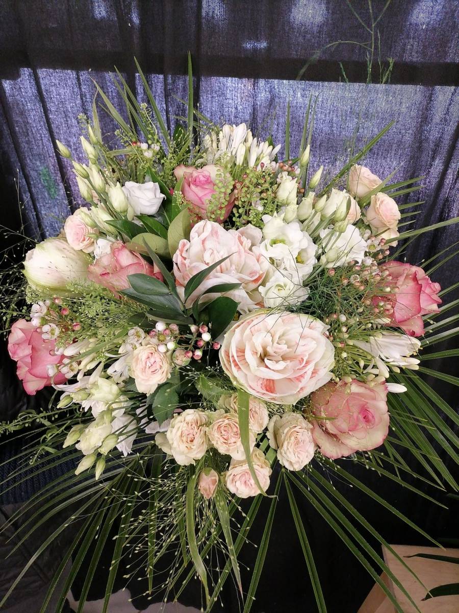 Bouquet nature composer d'amaryllis blanc et rose, de lisianthus blanc, de rose branchue rose pastel, de wax blanc, de rose Vintage, d'agapanthe blanche. Accompagner de son feuillage le roebellini, le ruscus, le panicum et le thlaspi.